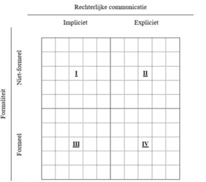 In de praktijk blijkt dat rechters, naast het doen van uitspraken, een scala aan mogelijkheden hebben én benutten om knelpunten in wetgeving bij de wetgever onder de aandacht te brengen. Ik heb deze verscheidenheid aan communicatiekanalen geanalyseerd aan de hand van twee dimensies: formaliteit en rechterlijke communicatie. Zie hiervoor Figuur 1.