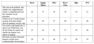 Tabel 1: Politieke stijlvoorkeuren en opleidingsgroepen (% (helemaal) eens; bron: NKO 2023).
